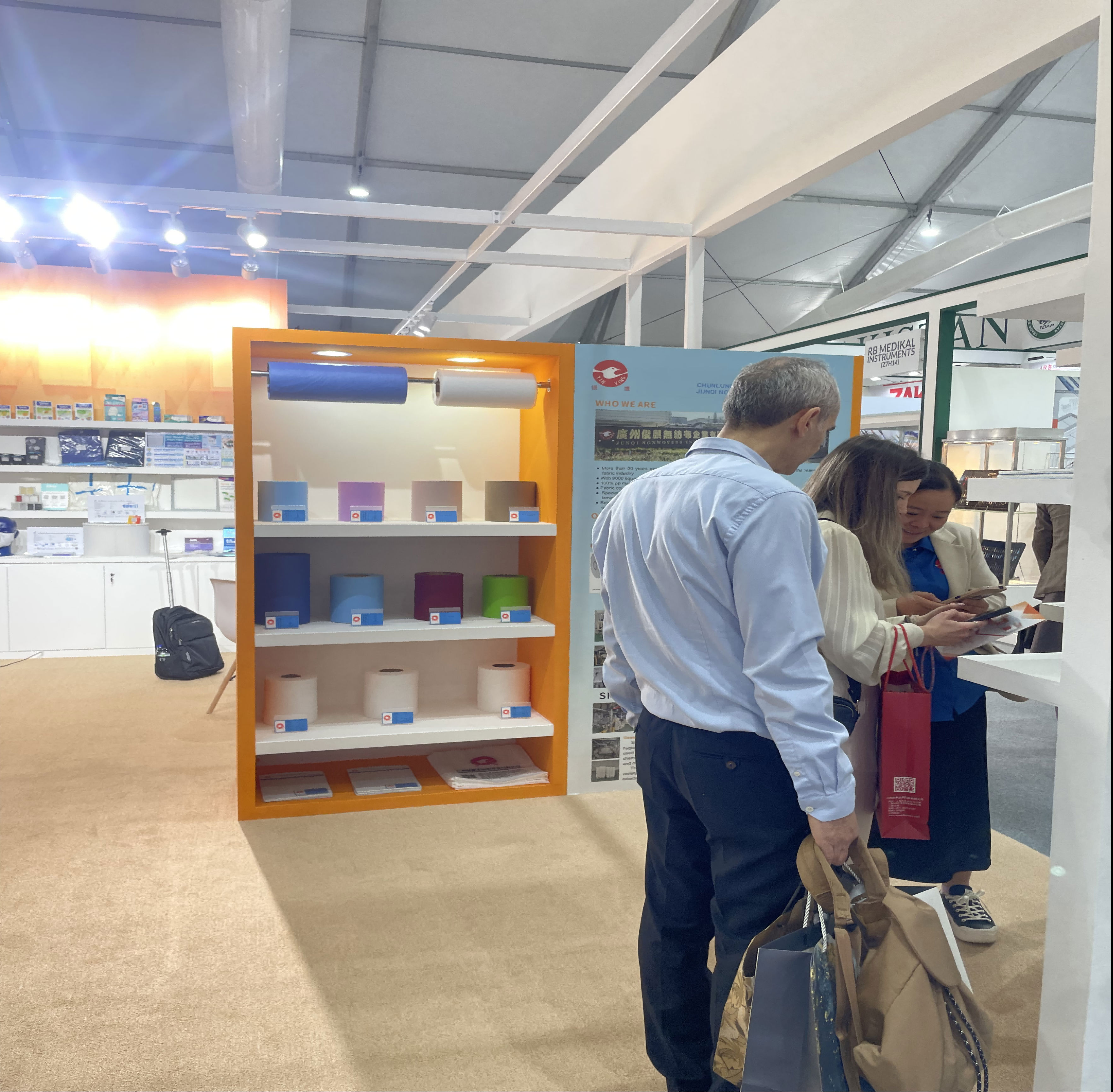 因为我们组织用特装布置展位,所以我们公司的展柜吸引了较多的客人前来咨询和了解我们公司的产品。参展过程中我们洽谈的客户有印度、埃及、东南亚、中亚、西亚、俄罗斯、中东、非洲等等。我司通过参展获得扩大商务接触面、开阔视野、启发新思路,让我们直观了解到不同地域无纺布行业的最新行情,无纺布工艺应用的多样性,对我司今后的发展带来新的挑战、新的契机。